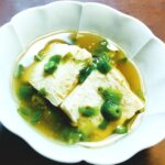解凍した冷凍絹ごし豆腐を薄味に煮て、蕗の薹の餡をかけました。