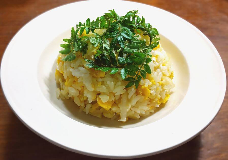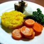 発芽オートグローツ入りご飯にサフランを一つまみ入れて炊きました。