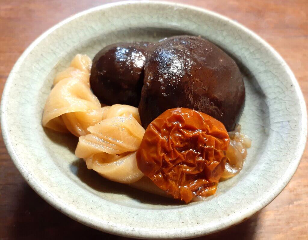 干し椎茸を戻したときの癖のある香りが気になるので、 玉葱、梅、ドライトマト、発酵玉葱などを加えて、毎回試しています。