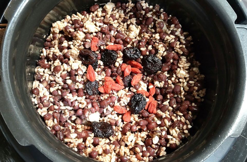 茹でた小豆と米麹を炊飯器に入れ、ドライグリーンレーズンを加えてみました。